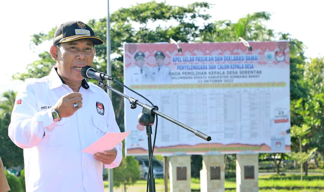 Bupati memberikan pesan kepada seluruh peserta kontestasi Calon Kepala Desa dalam moment deklarasi Pilkades Damai sebagai rangkaian dari pelaksanaan Pilkades Gelombang Pertama bulan Oktober tahun 2022, yang bertempat di halaman Graha Fitrah Kantor Bupati Sumbawa Barat, Komplek KTC, Selasa, (11/10/22).