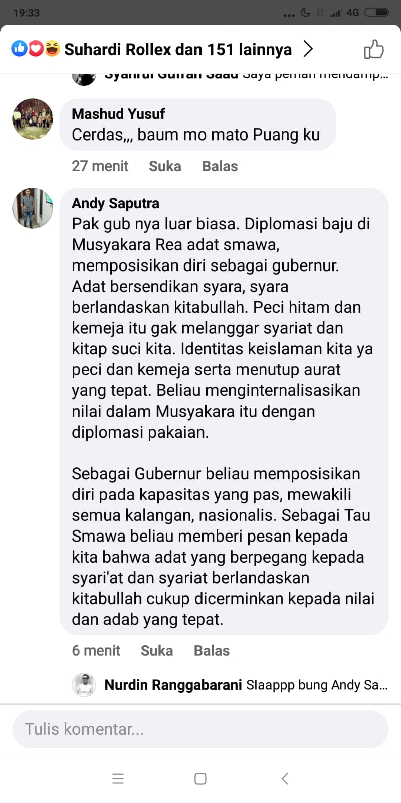 “Erdi Jaya, kekuatan budaya itu pada muatan nilai yang ditampilkan melalui pesan-pesan simbolik. Bila kita tak bisa lagi bicara tentang bahasa dan pesan simbolik, maka tamat pula substansinya. Mohon maaf bila saya keliru,” kata Nurdin, menjawab komentar netizen, Erdi Jaya.
